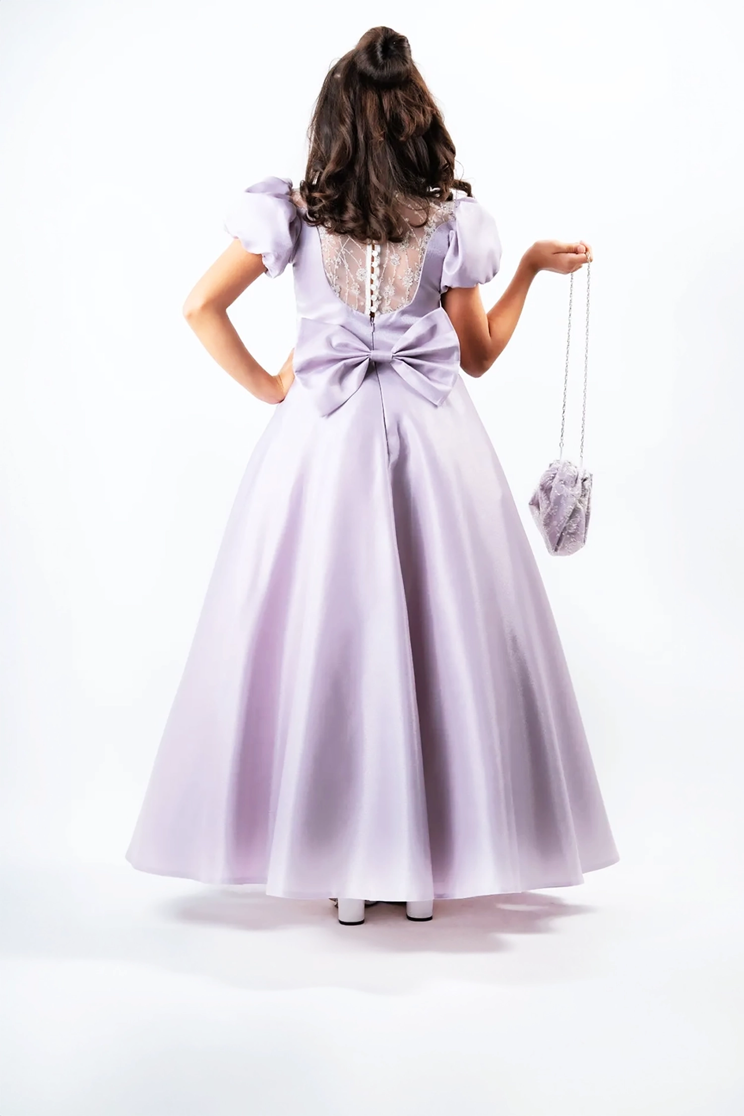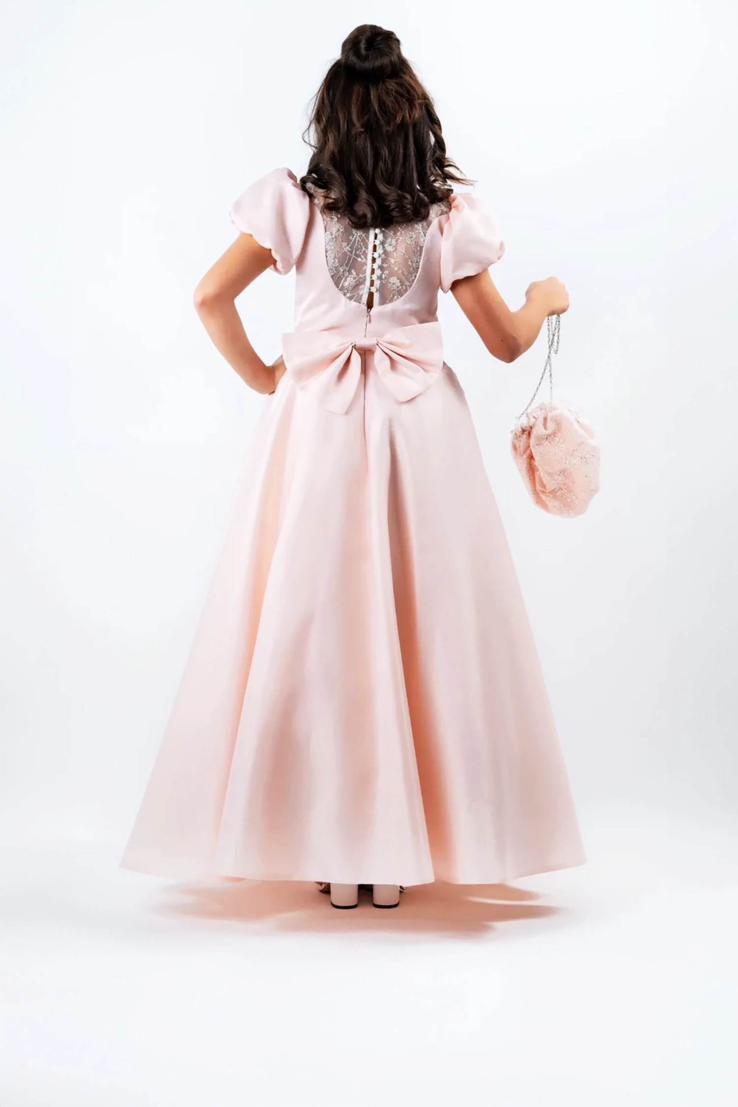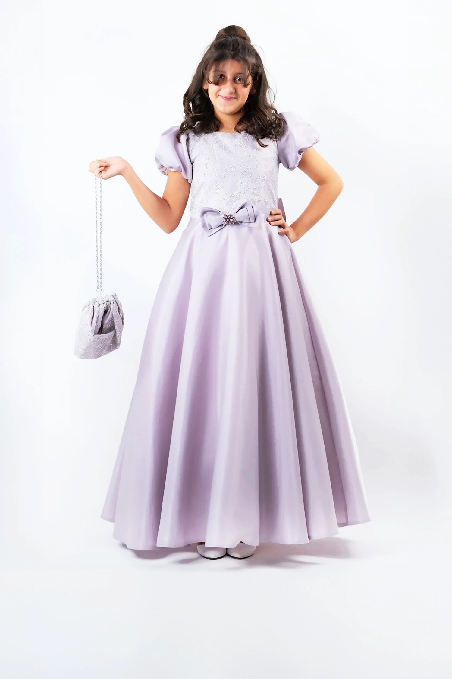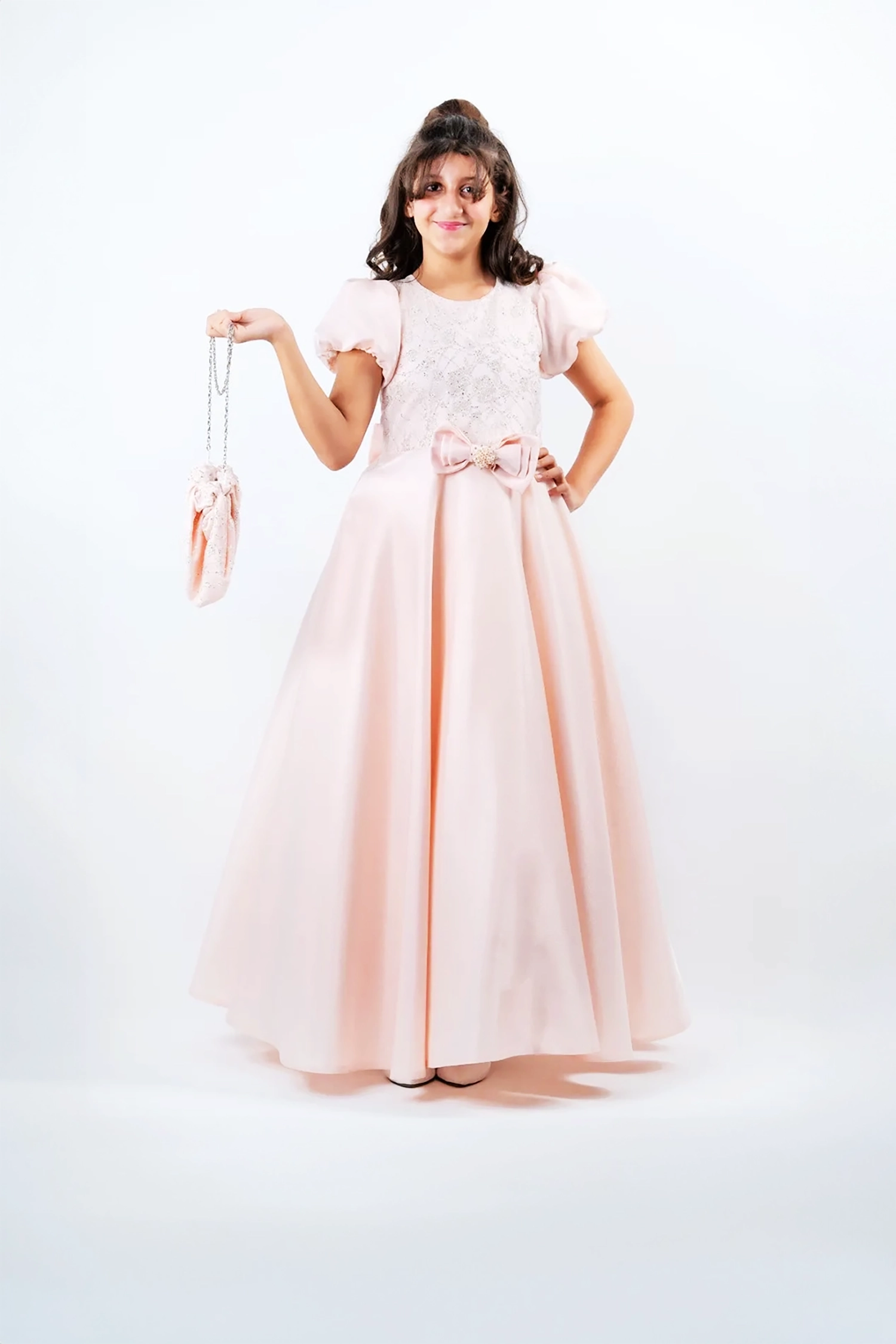 A distinctive gown, designed with elegance and sophistication, made of luxurious imported satin fabric that adds a touch of luxury and elegance, with a touch of tulle fabric that adds glamour and glamour to the look. The dress also features short puffed sleeves that add a touch of princess-like femininity, making it perfect for any party or special occasion.