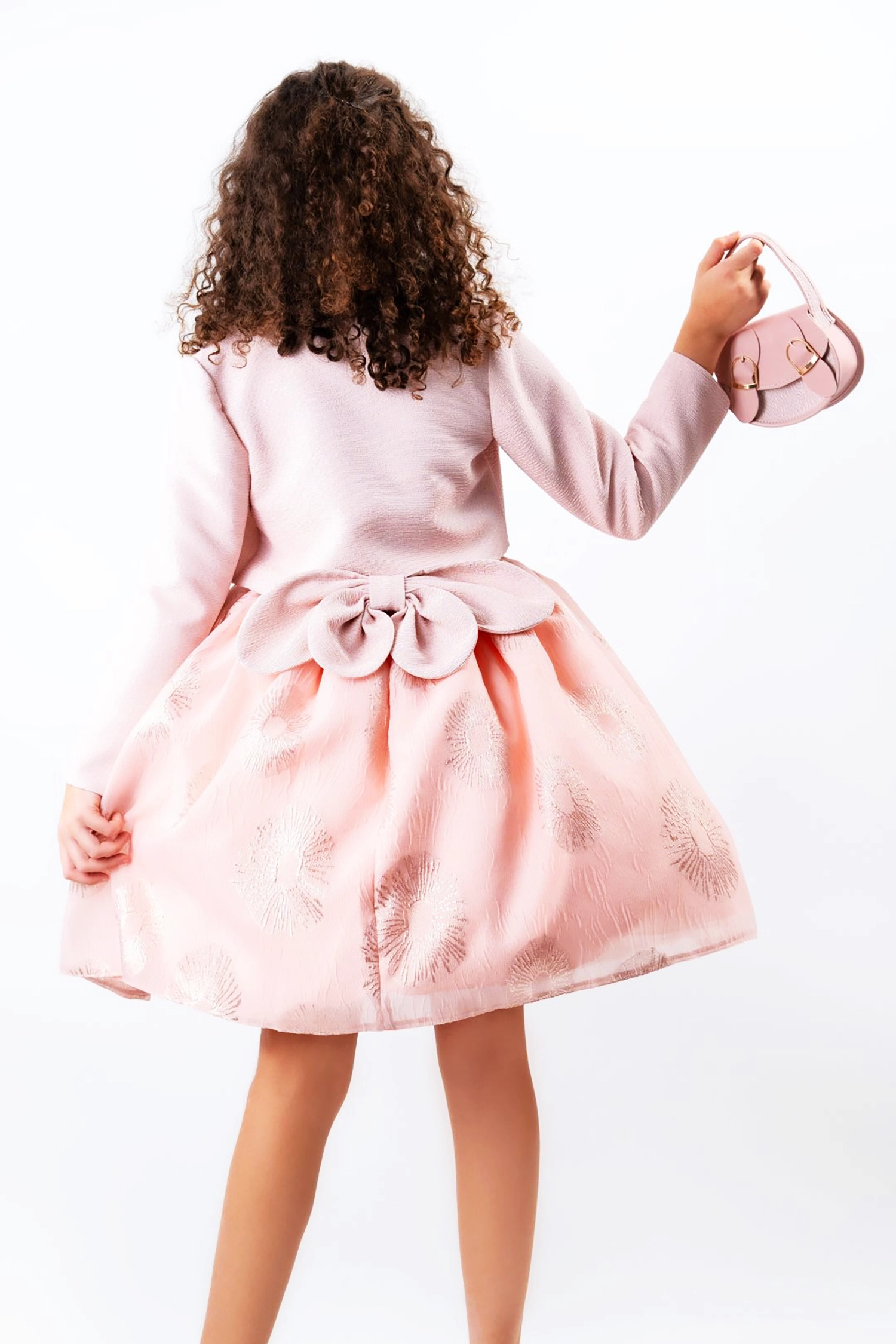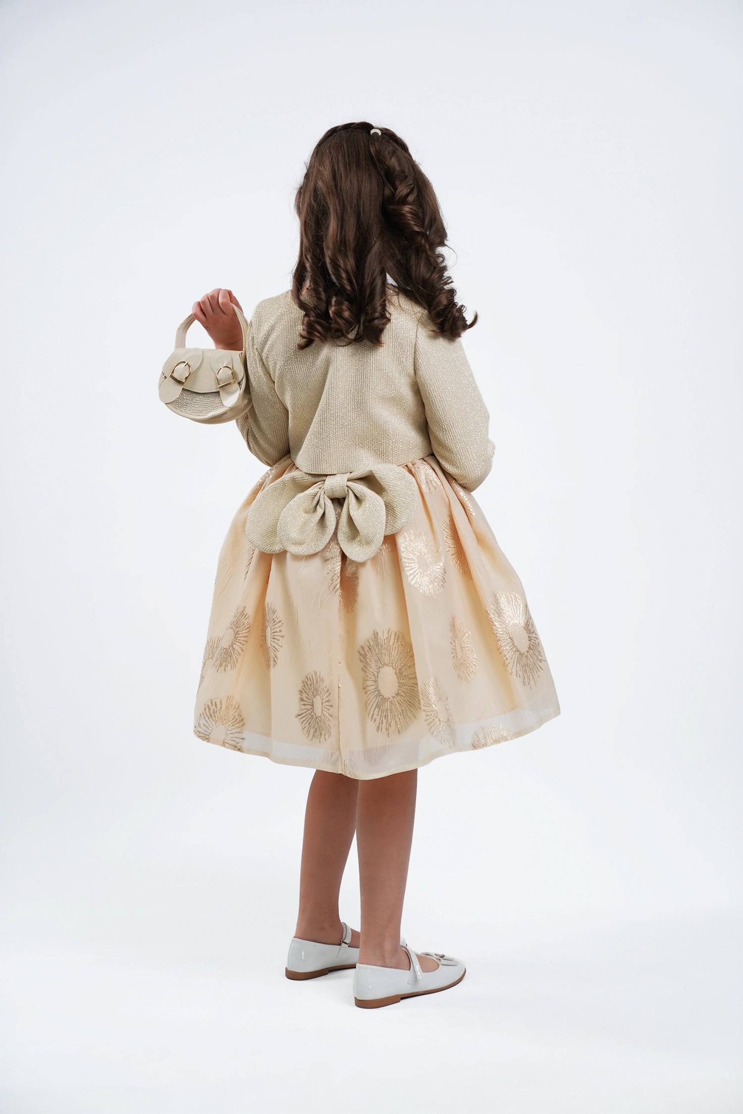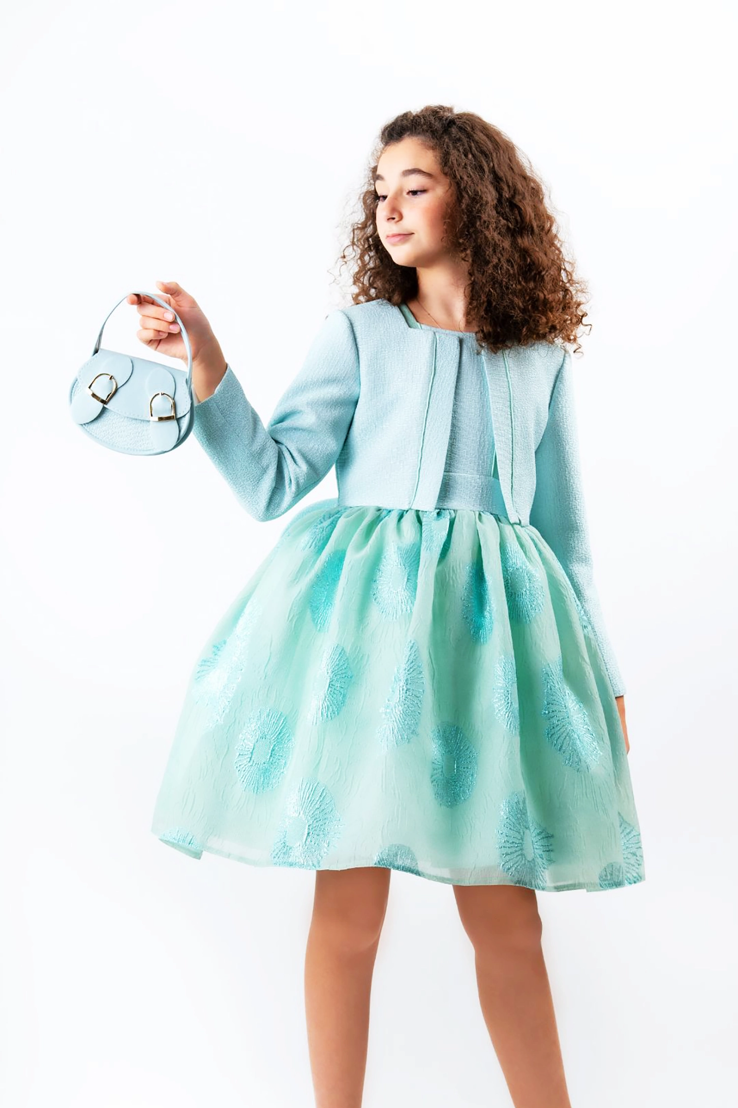 Featuring lively Jacquard fabric accented with subtle “Lighting” (strass) embellishments, this winter dress and bolero set is designed for playful elegance. It’s a charming, comfortable option perfect for parties and gatherings where she needs a touch of festive sparkle.