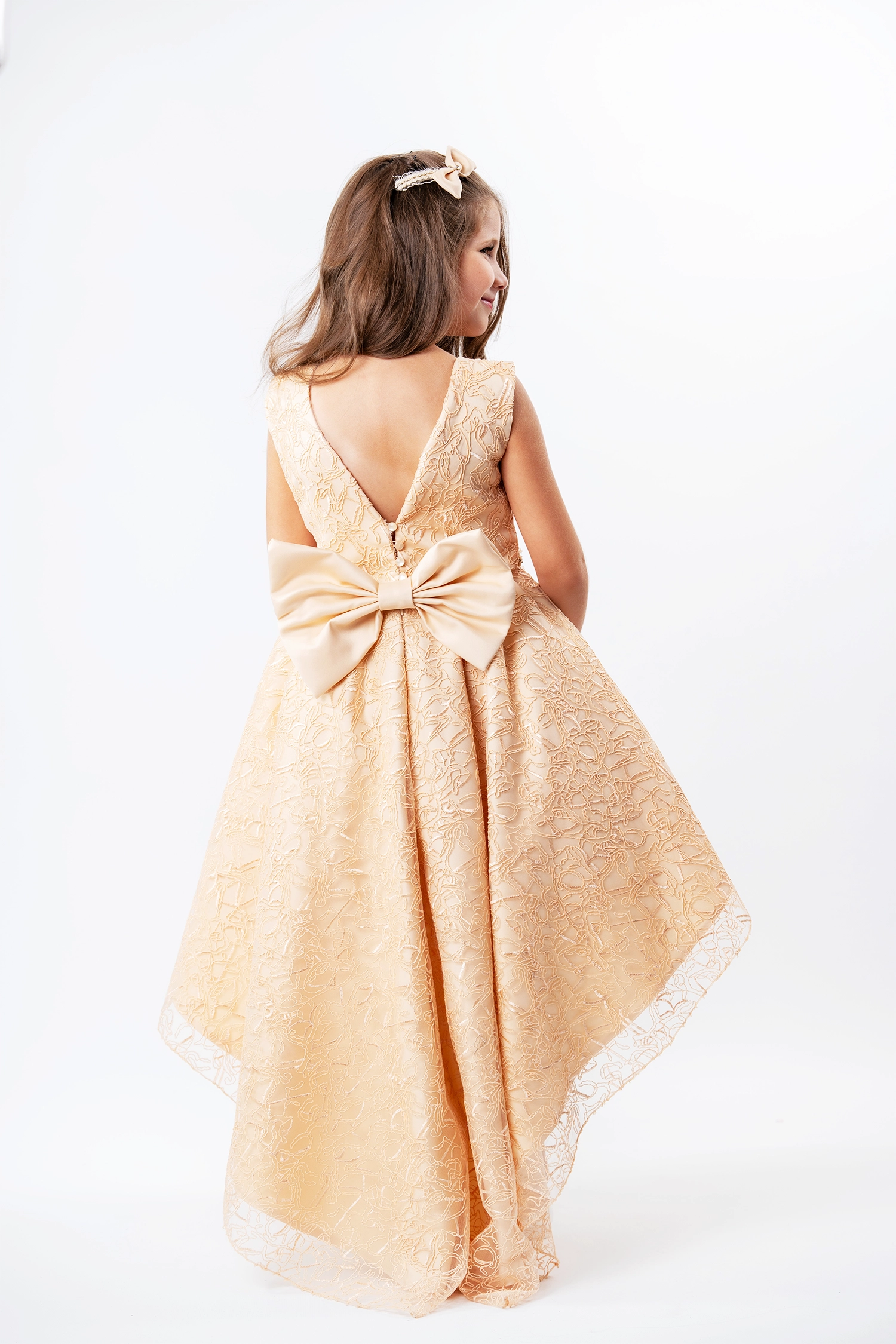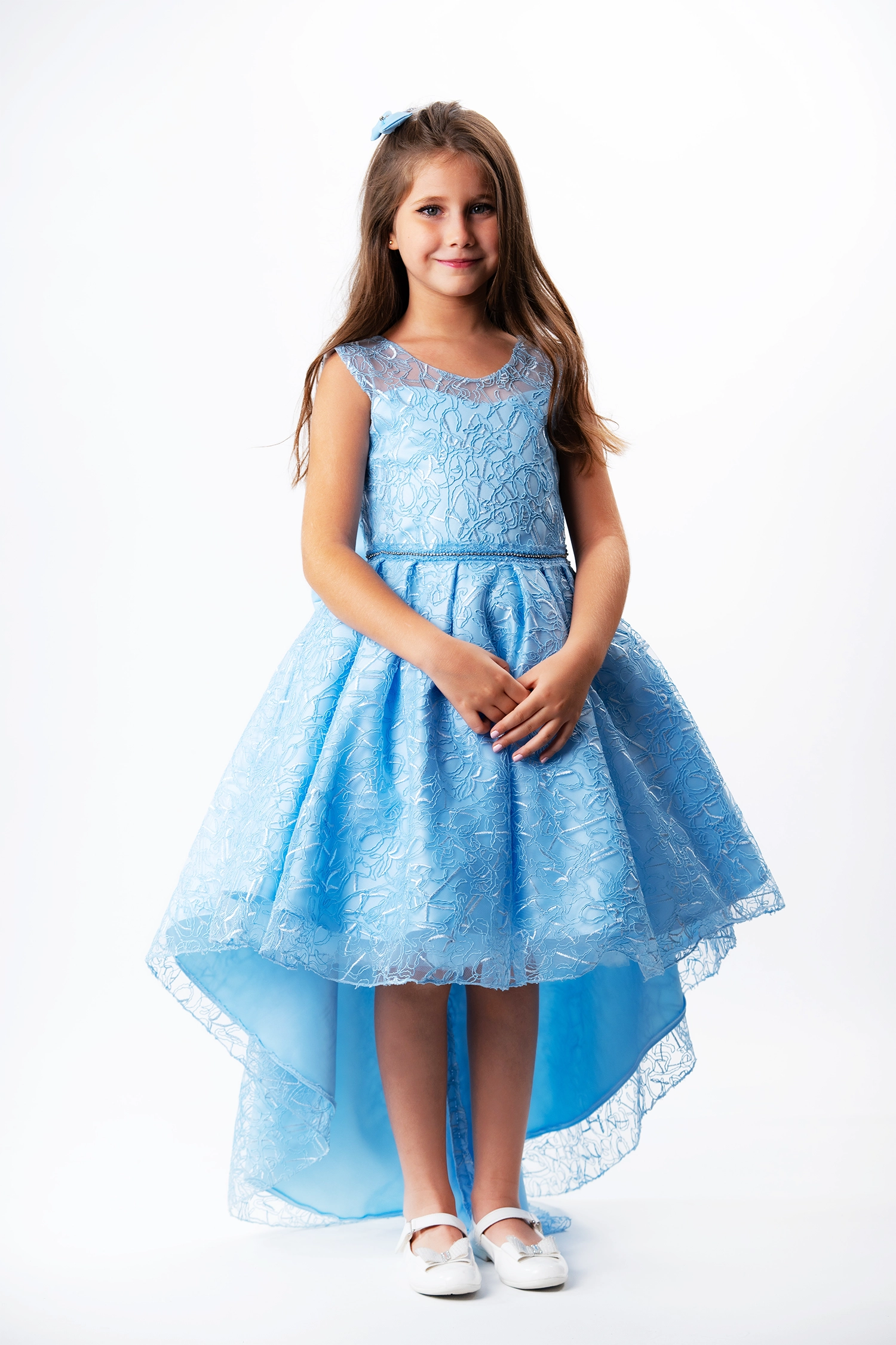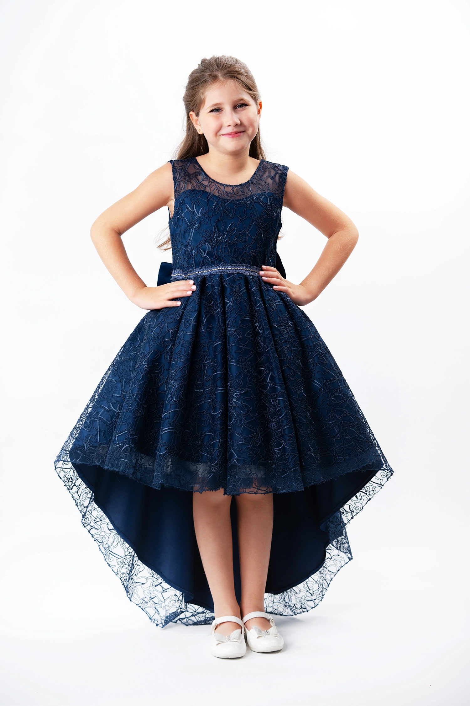 For any graduation party, wedding or soiree, this elegantly tailored dress is made from a lace fabric embroidered with sparkling crystal threads that add a touch of glamour and beauty to the look. The cut is elegant and intricately detailed, with the addition of luxurious satin accents that add to the appeal of the dress.