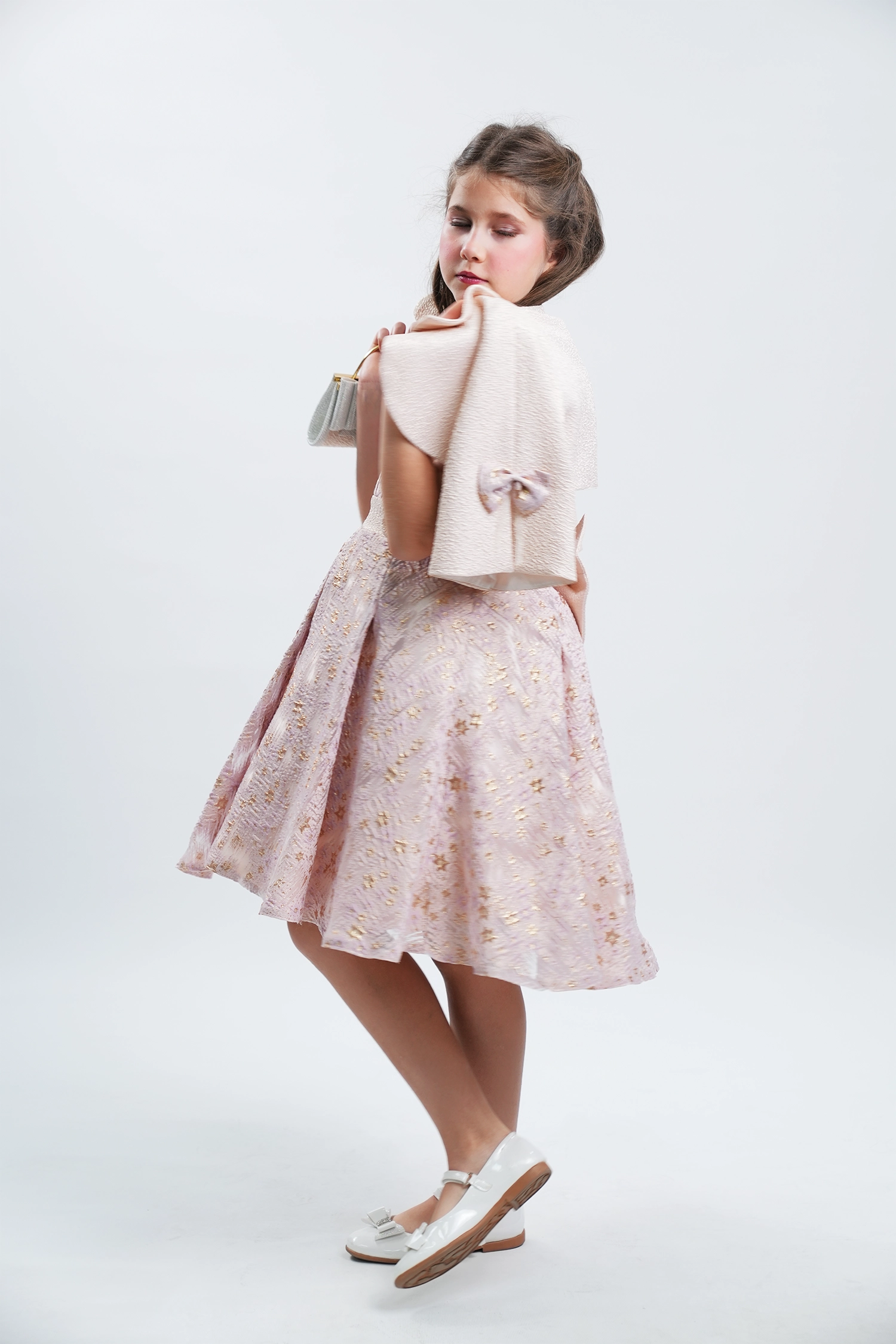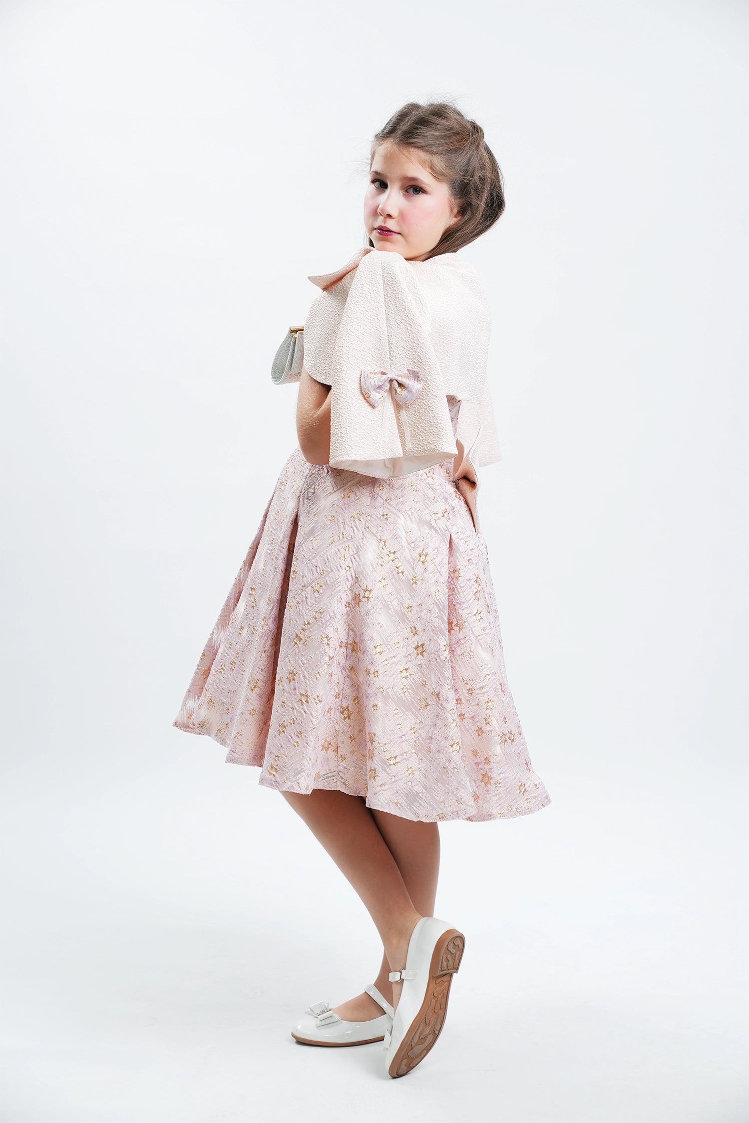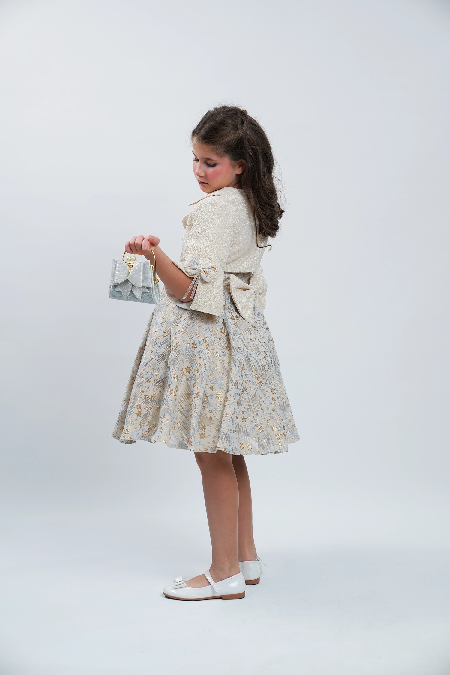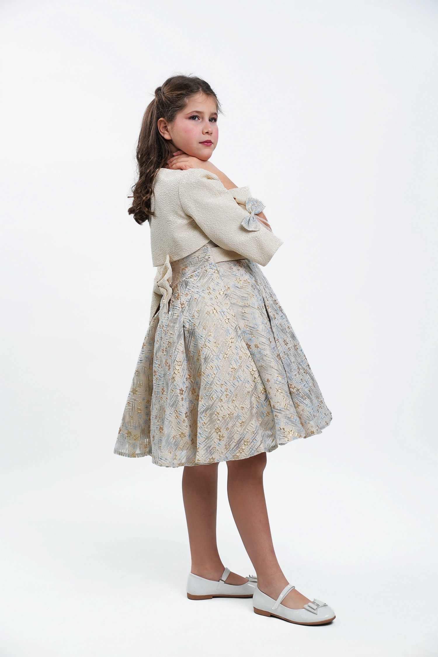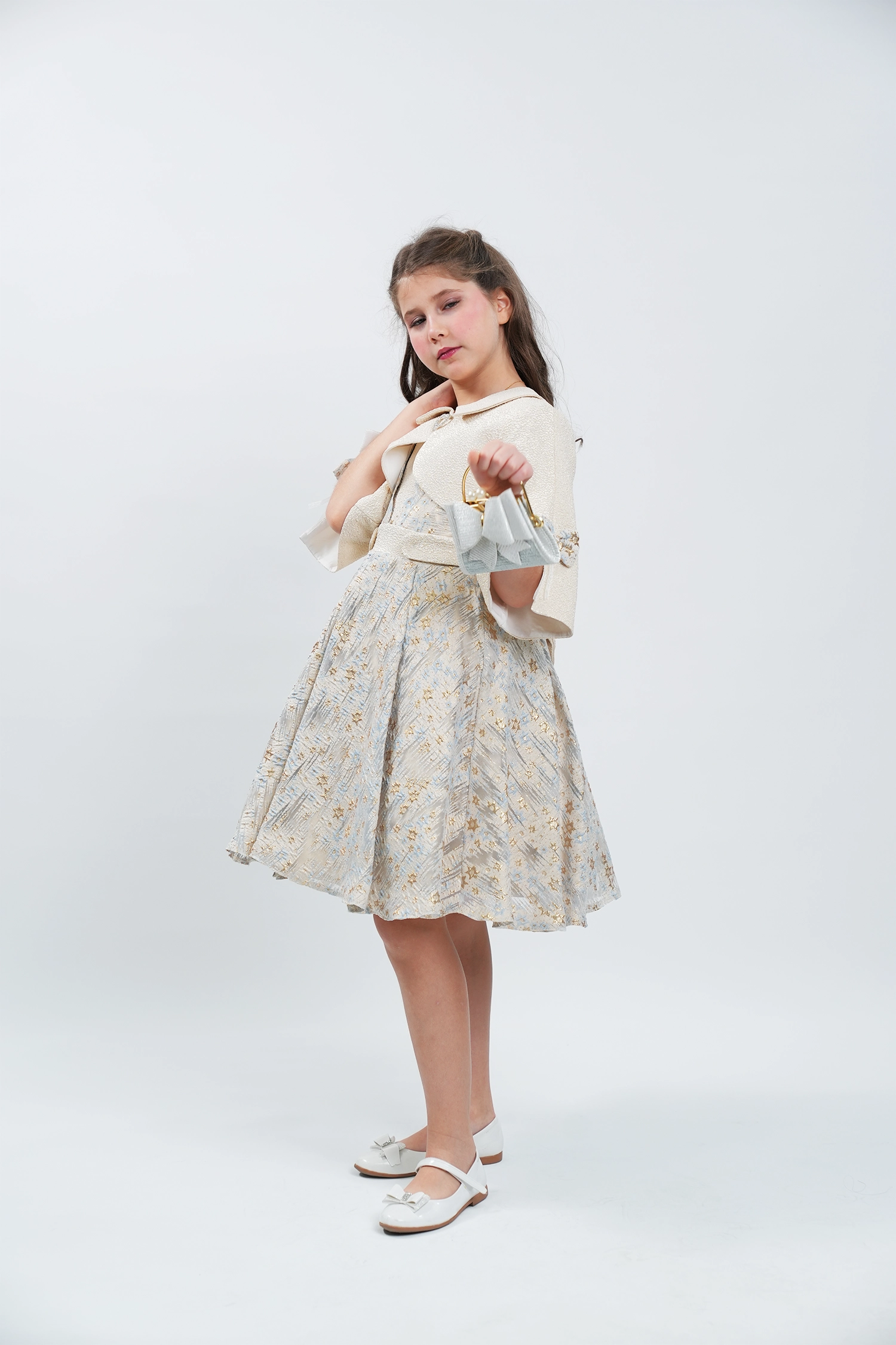 This luxurious winter dress and matching bolero are crafted from shimmering Jacquard Organza and a luminous Lighting Jacquard fabric. It’s the perfect ensemble for holiday parties or formal gatherings, ensuring she stays warm while making a sophisticated, festive statement.