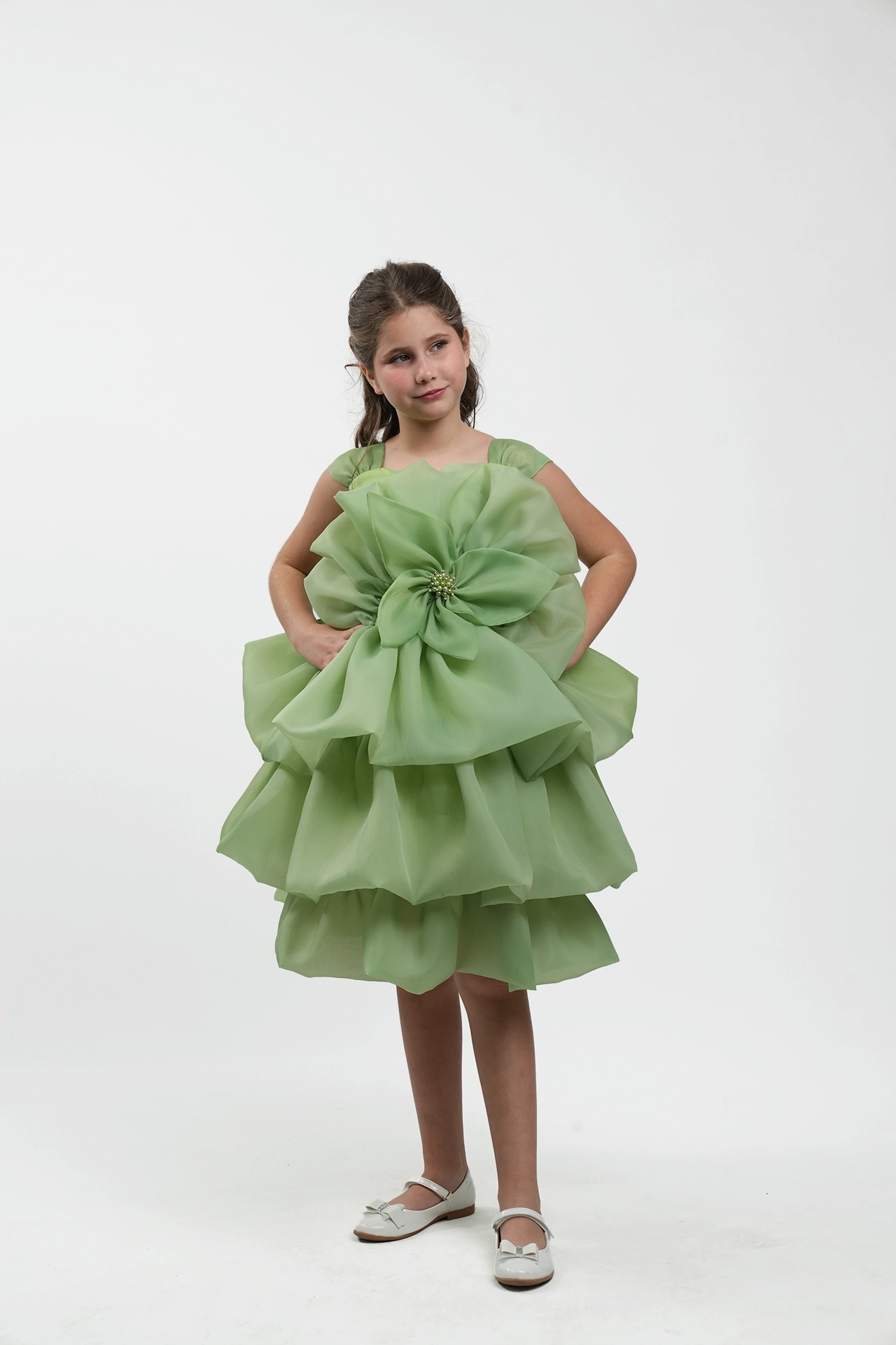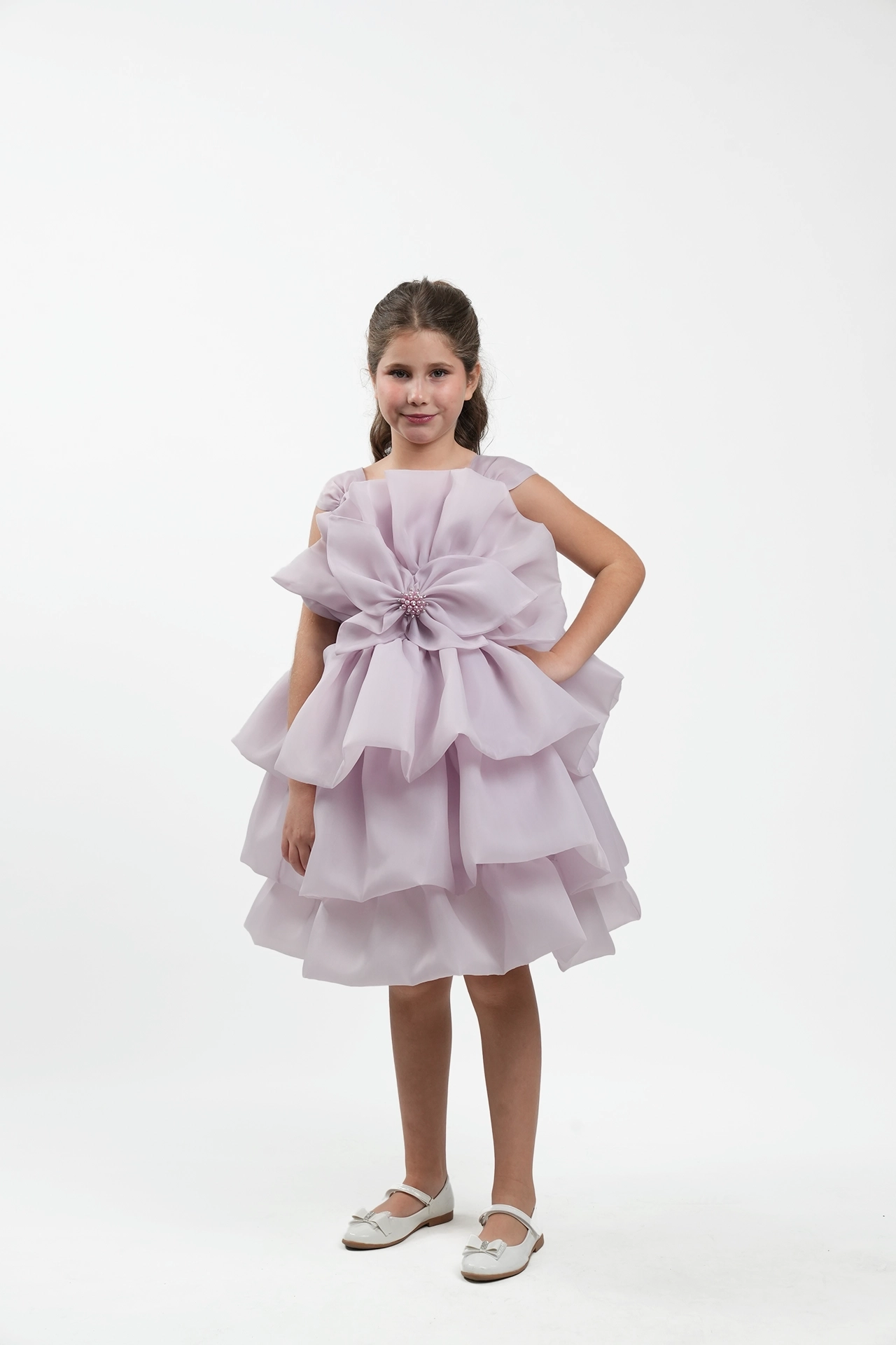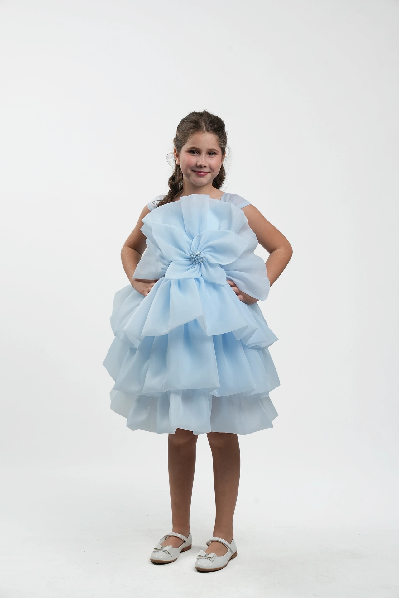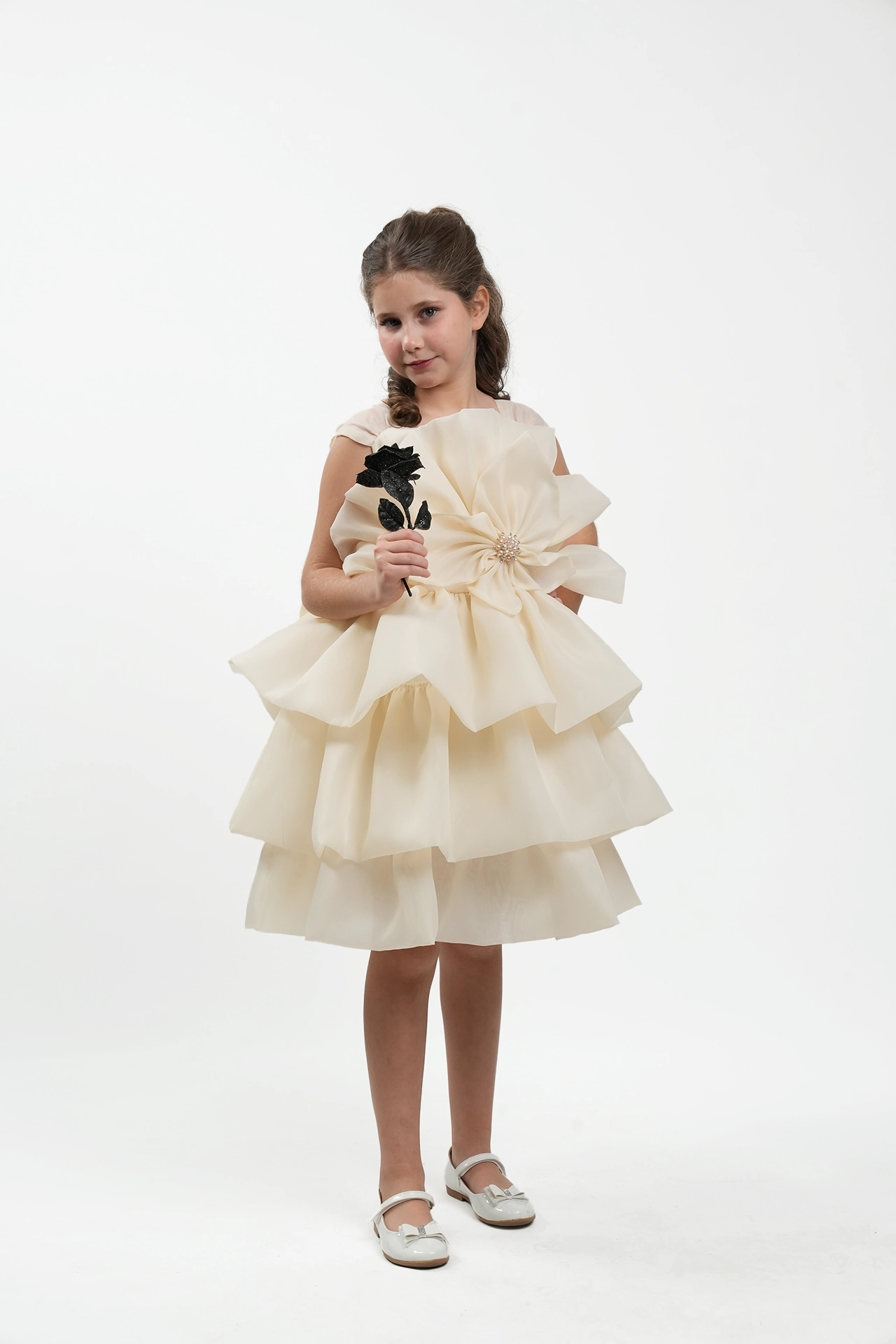 Elegant bridal dress made of organza with wavy design and large flower detail