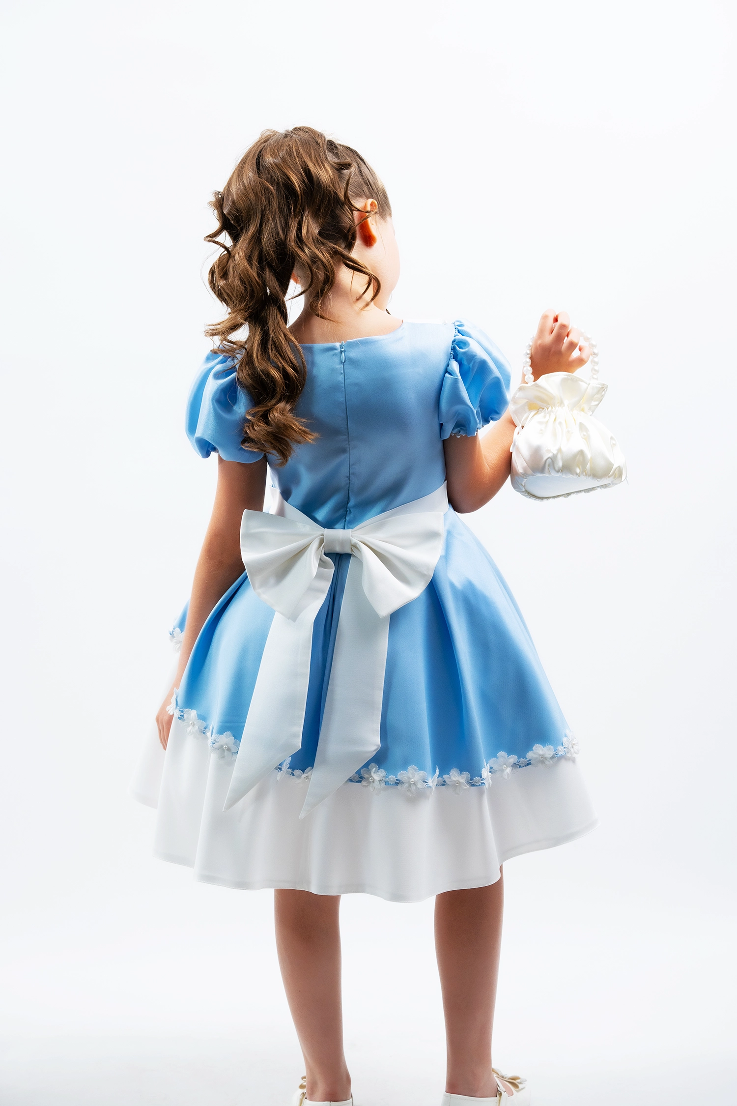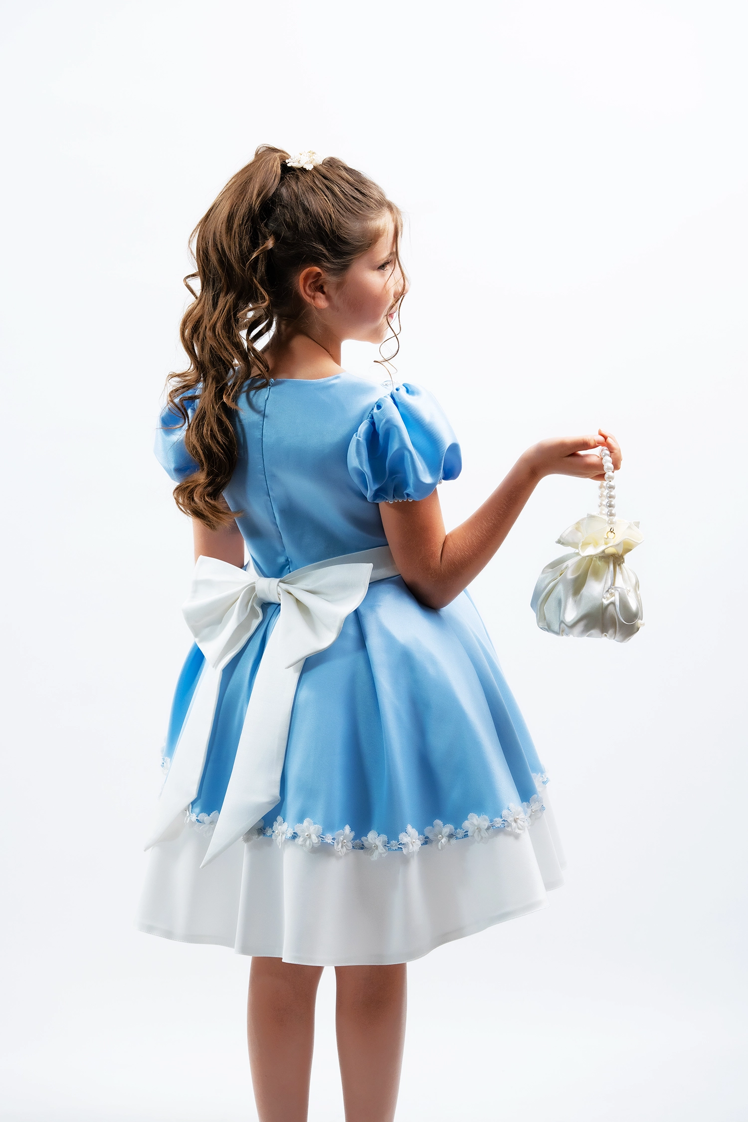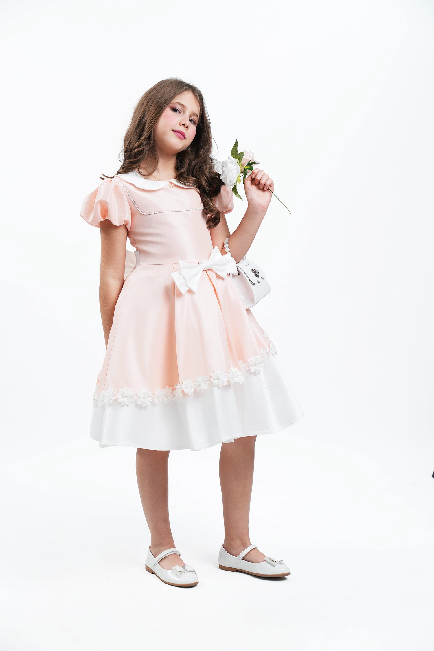 A feminine and refined design featuring flounce sleeves and floral lace details, crafted from premium lycra mikado for a sophisticated look.