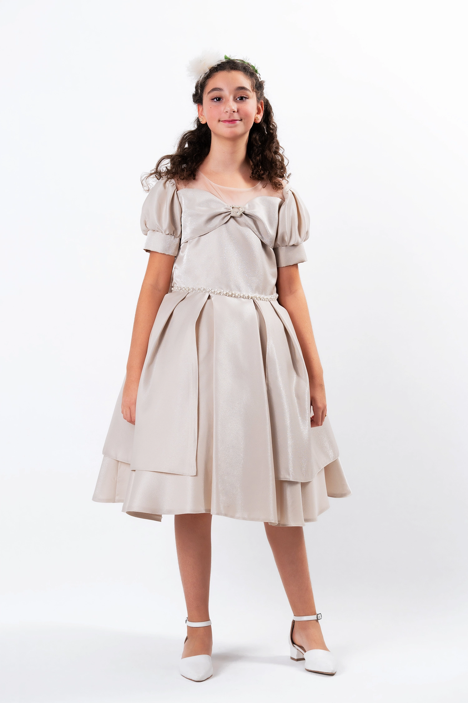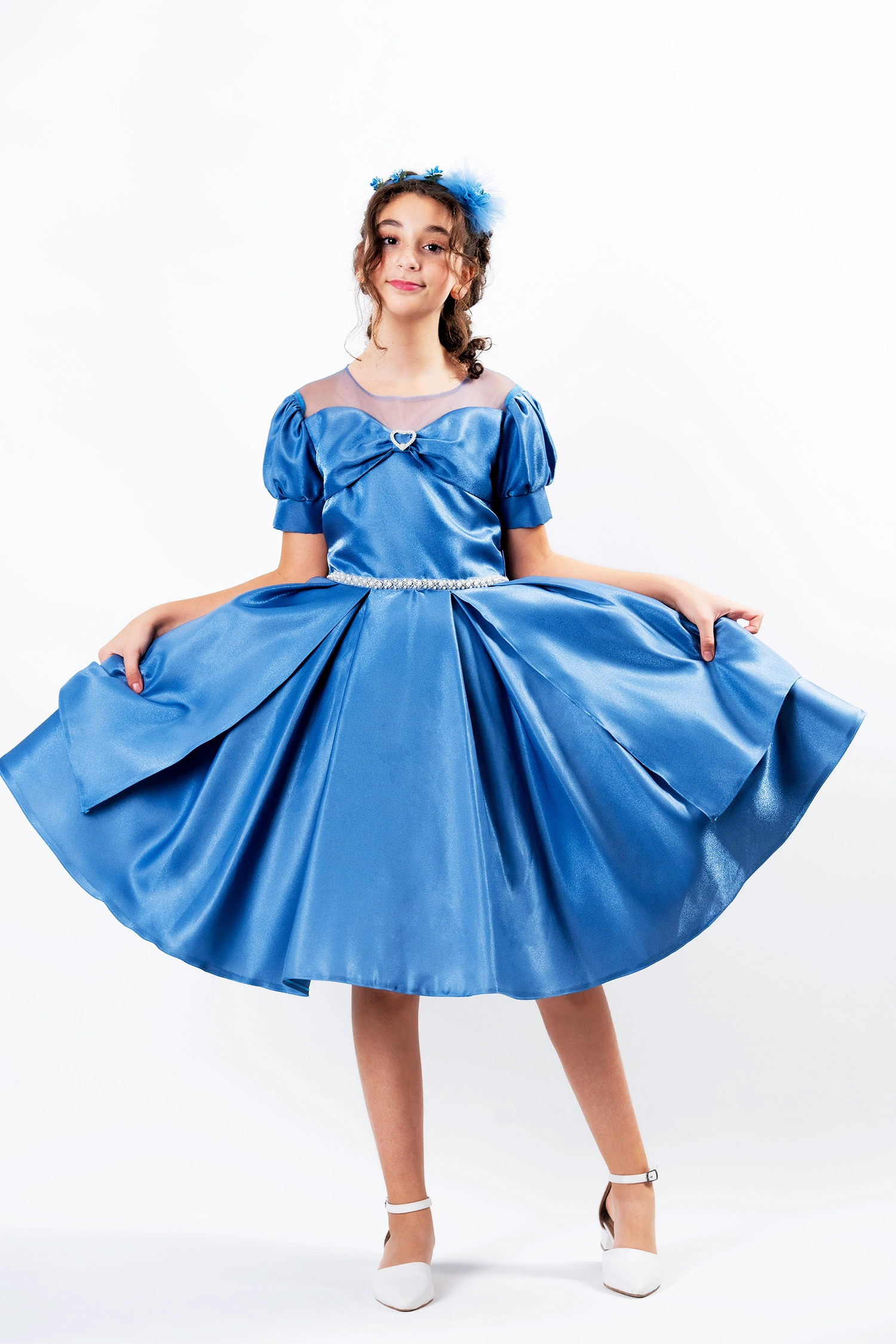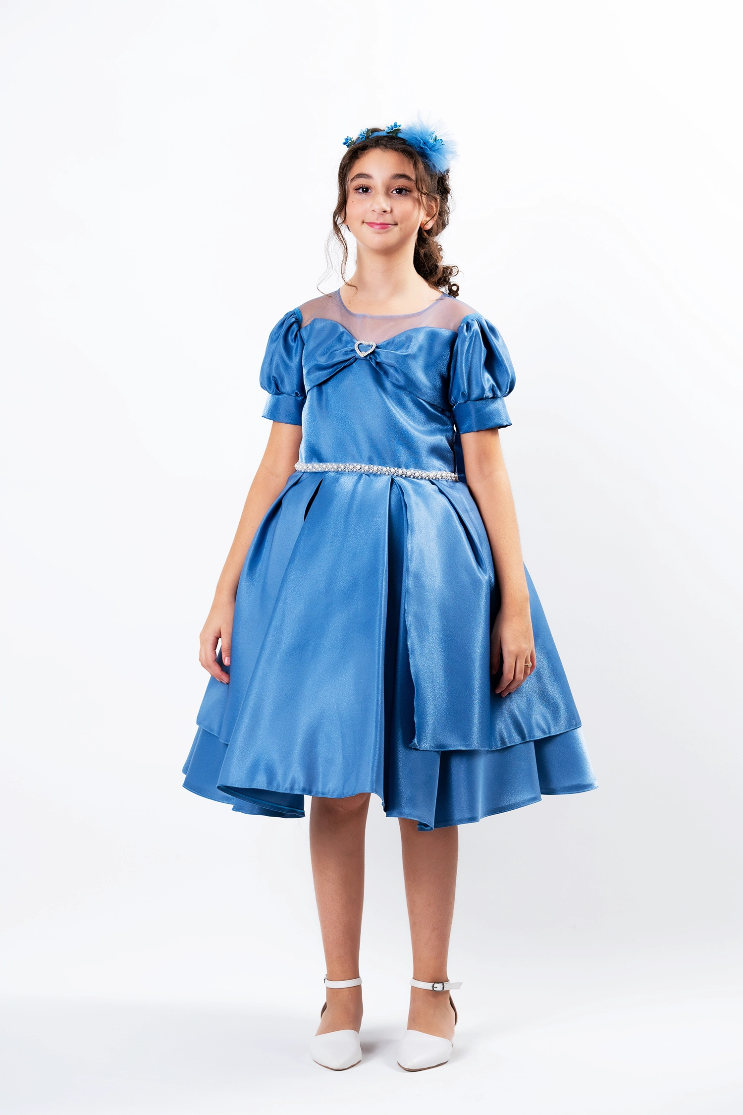 An elegant gown for every occasion, crafted from a shimmering satin fabric that gives it a touch of luxury. The dress features a luxurious design with a flared double clutch skirt with extra layers and tulle sleeves that add a touch of sophistication